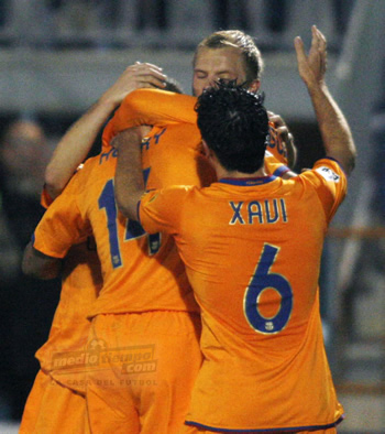 El partido empezó con un lanzamiento de Márquez de falta ajustado y con alguna jugada de peligro debido a triangulaciones, pero no sería hasta el 25´, en una buena triangulación Henry-Gudjhonsen-Xavi, y el francés enchufó. Antes del descanso Gudjhonsen pudo sentenciar, pero su lanzamiento se estrelló en el palo.