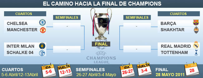 La suerte esta echada. Ya se conocen los emparejamientos para los cuartos de final de la Champions League. El FC Barcelona se enfrentará al Shaktar Donestk. El resto de emparejamientos son Real Madrid-Tottenham , Chelsea-Manchester United, e Inter de Milán-Schalke 04.